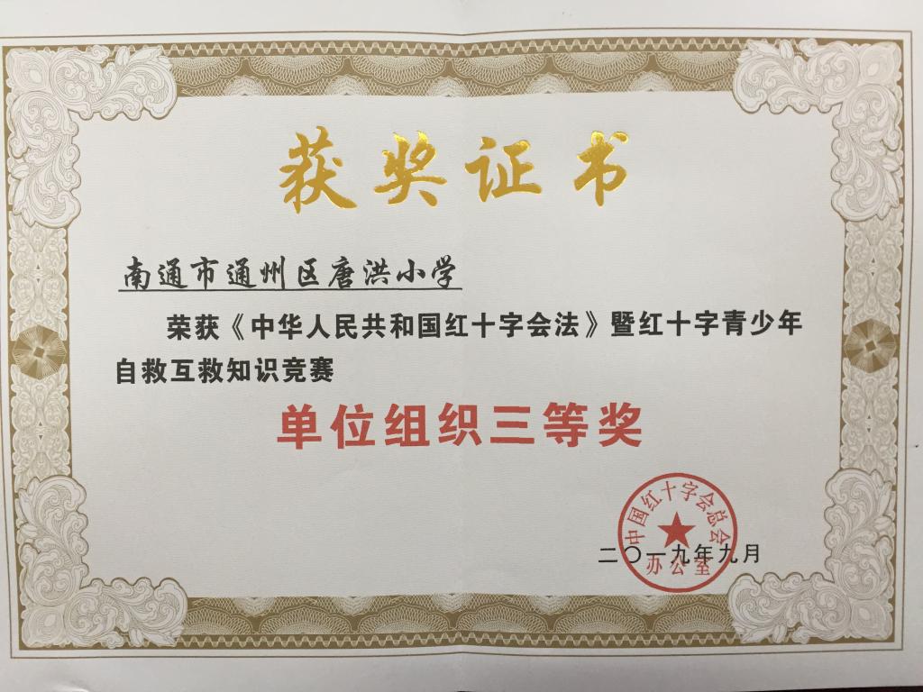 2019年9月 红十字青少年自救互救知识竞赛单位组织三等奖