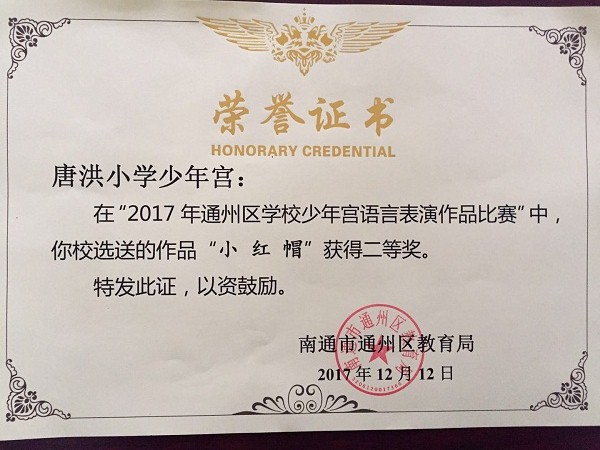 2017年12月 区学校少年宫语言表演作品比赛获二等奖