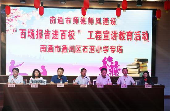5月30日下午,南通市师德师风建设“百场报告进百校”工程宣讲教育活动走进石港小学,以“加强师德师风建设,做新时代党和人民满意的好老师”开展教育宣读活动。通北片各中小学三百多名教师参加了活动,通州区教育局副局长钱国华主持了活动。南通市教育发展学院培训部余沪军、项目部陈夷秋主任、严凌琳老师、通州教师发展中心葛建华副主任、通北督导组陈志锋校长参加了本次活动。