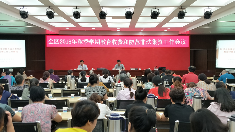 8月30日下午,区教育局与区金融办在行政中心第一会议室联合部署2018年秋季学期各类学校教育收费和防范非法集资工作。全区各中小学校财务管理员、各教育督导组分管领导以及幼儿园园长近180人参加了会议。