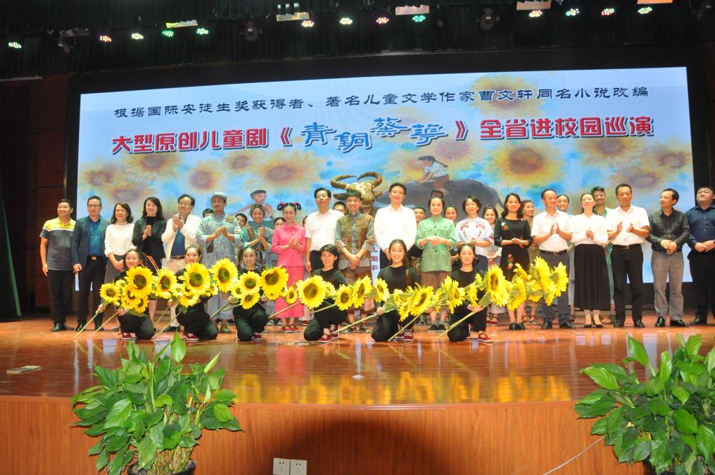 儿童剧《青铜葵花》是江苏省文明委重点推广巡演剧目,改编自著名作家曹文轩2005年创作的长篇小说《青铜蔡花》,由“童声里的中国”少儿艺术创研活动基地、省少年儿童文化促进会承制,常州市金坛华罗庚艺术团演出。该剧将在全省公益巡演240场,首站在南通启动,巡演30场。