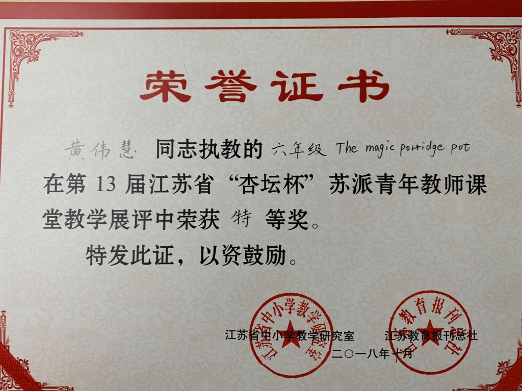 金秋十月,丹桂飘香,10月23日—25日,由江苏省中小学教学研究室、江苏教育报刊总社主办的江苏省第13届“杏坛杯”苏派青年教师课堂教学展评总决赛(小学组)在淮安市实验小学举行。我区实验小学黄伟慧老师在众多参赛选手中脱颖而出,取得英语组特等奖第一名的佳绩。