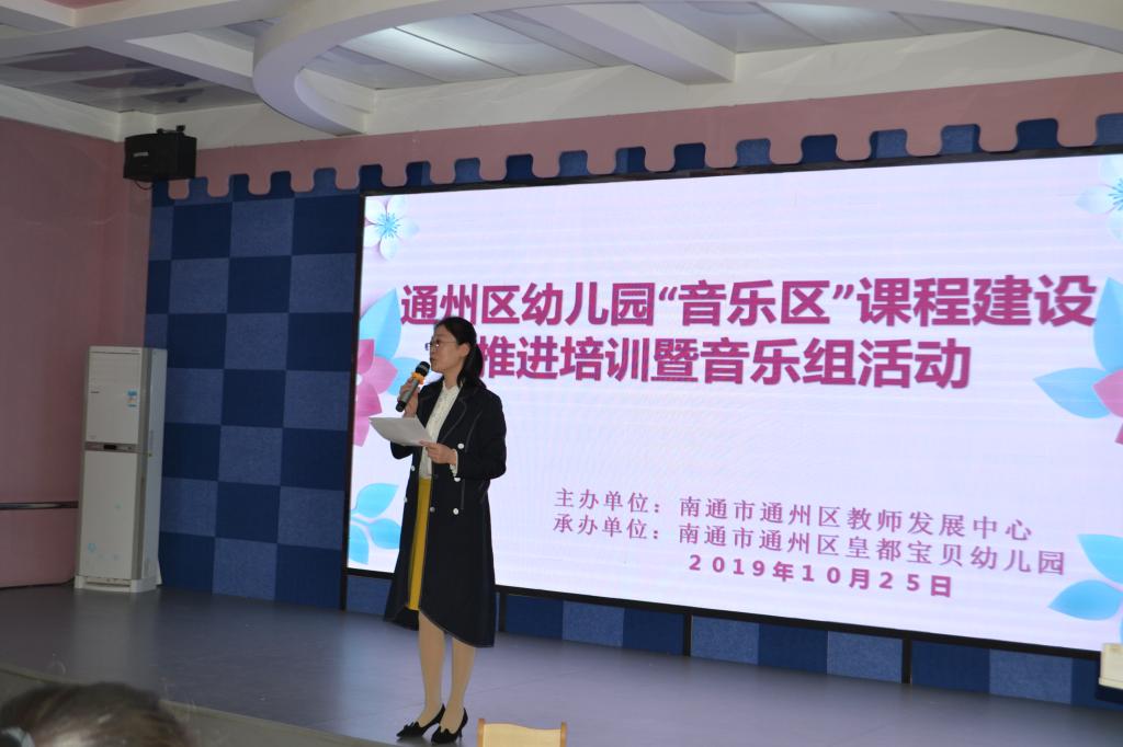 为深入贯彻学习《省教育厅关于加强学前教育教研工作的意见》,同时进一步推动区域课程建设,提升全区幼儿园课程游戏化水平。10月25日,由通州区教师发展中心主办、通州区皇都宝贝幼儿园承办的“通州区幼儿园‘音乐区’课程建设推进培训活动暨音乐中心组成员阶段研究成果展示活动”在缤纷秋日中闪亮开场。通州区教育体育局基教科幼教专干王向红、通州区教师发展中心学前教育专职研训员徐玲艳参加并指导本次活动的开展,区音乐领域兼职研训员、区音乐中心组全体成员、全区各幼儿园的教科研负责人、骨干教师等130多人参加了展示与研讨活动。
