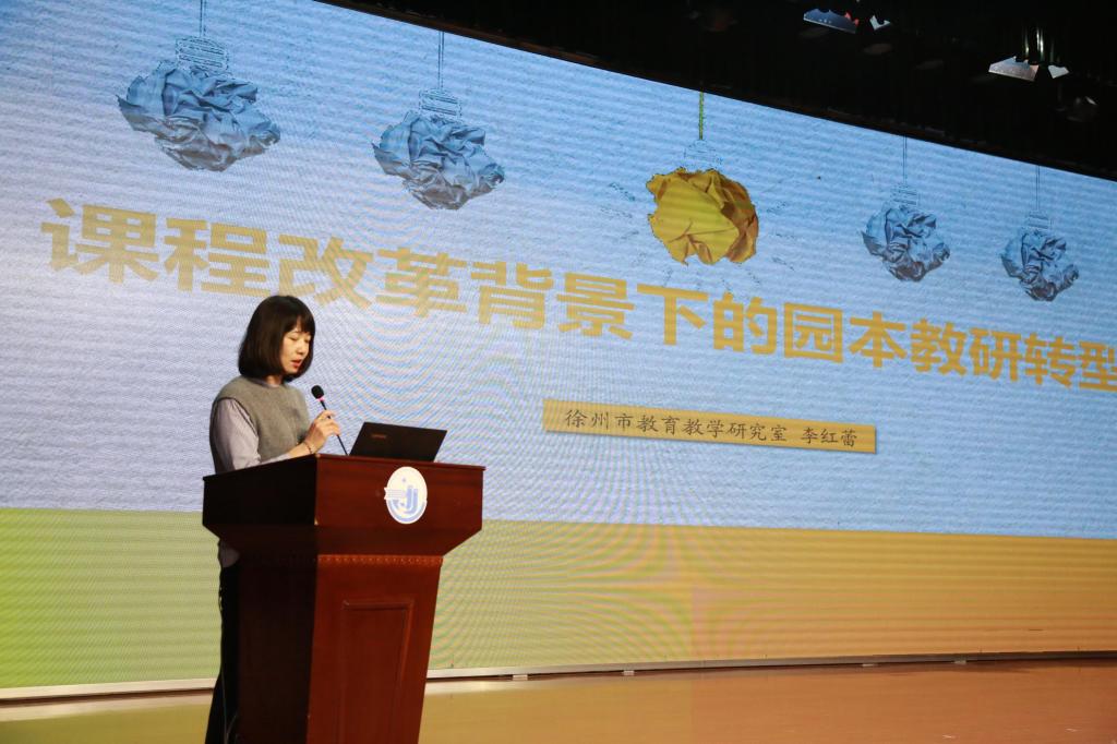 徐州市教育教学研究室李红蕾主任从“教研的概念”、“教研非大事”、“真教研中学《指南》”、“温暖的教研故事”四个方面作了题为《课程改革背景下的园本教研转型》的讲座,为在座的老师指明了“如何选择教研方向”、“如何选择教研问题”、“如何做好园本教研工作”的工作方向。