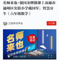 “一名好教师,总是握有一把又一把开启孩子智慧的钥匙。他们善于灵活运用新课程标准,设计匠心独具的教学方案;他们善于突出知识点,深入浅出地传道授业;他们善于触类旁通,潜移默化地教会学生举一反三。”为进一步推广名优教师的教学经验,积累丰富的在线教学资源,近期“学习强国”江苏学习平台联合江苏·中国江苏网面向全省中小学教师开展“名师来也·强国金牌微课”征集活动。省特级教师、省教学名师、区教师发展中心研训员任卫兵是我区8个南通市中青年名师工作室领衔人之一,其工作室及时宣传发动,精心组织策划,积极编辑投稿,目前工作室成员戴国军、顾燕等老师的微课已在平台成功发布。