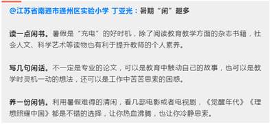 为了让教师利用暑期时间为自己更好地加油充电,南通市中青年名师任卫兵工作室借助“人民教育”微信公众号编读互动栏目,组织工作室成员开展了“互晒假期 目标共谋全人发展”交流活动。