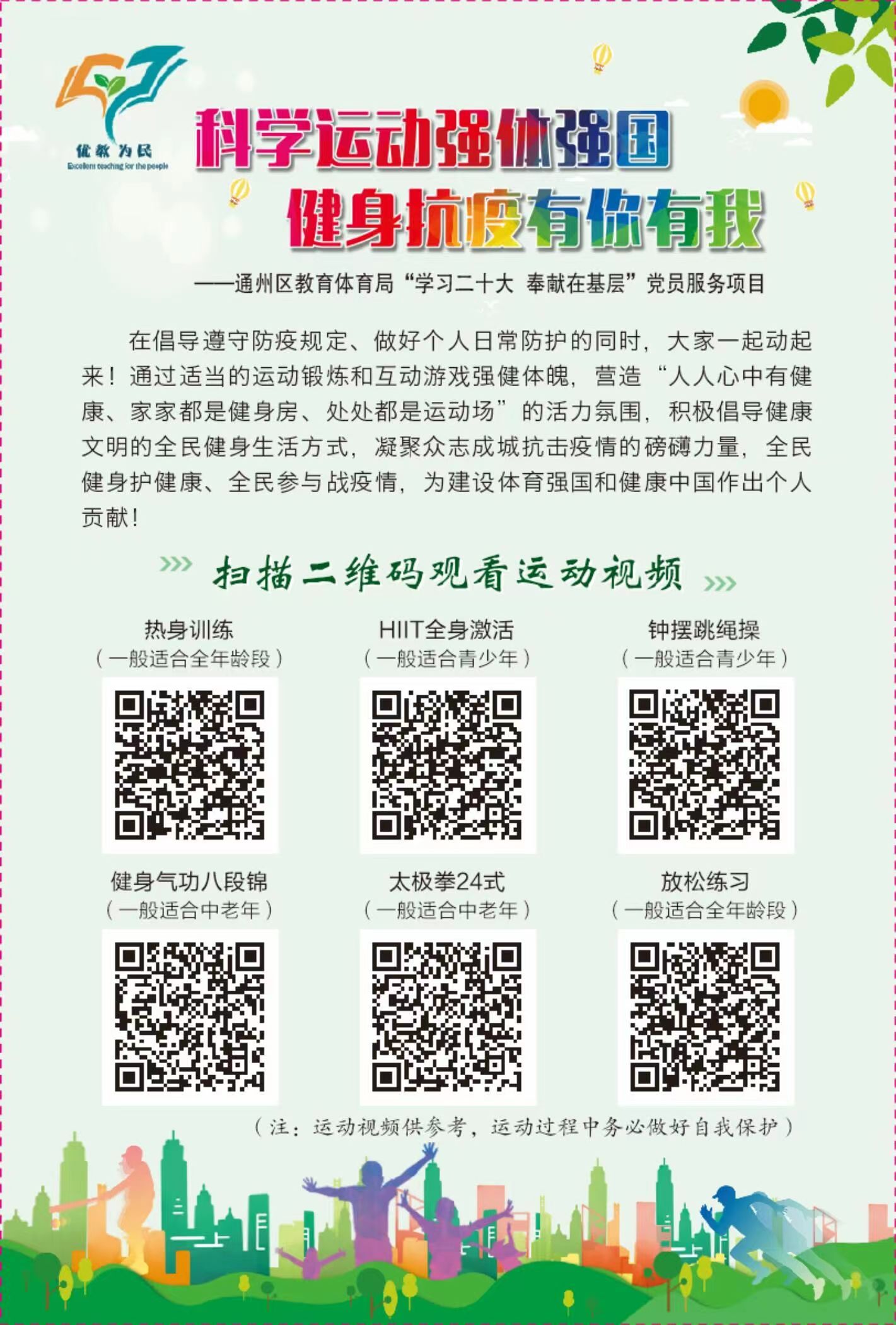 科学运动强体强国,健身抗疫有你有我!区教体局通过教授健康操、普及健康知识等形式,积极推广群众体育运动项目,倡导健康文明的全民健身生活方式,凝聚众志成城抗击疫情的磅礴力量,全民健身护健康、全民参与战疫情!