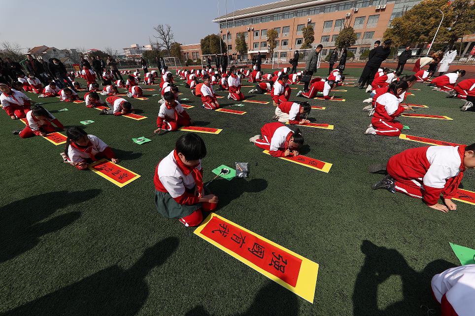 400多名石港小学学生齐聚操场一起挥毫泼墨,齐书“强国有我”,展示了学校“写字育人”成果。