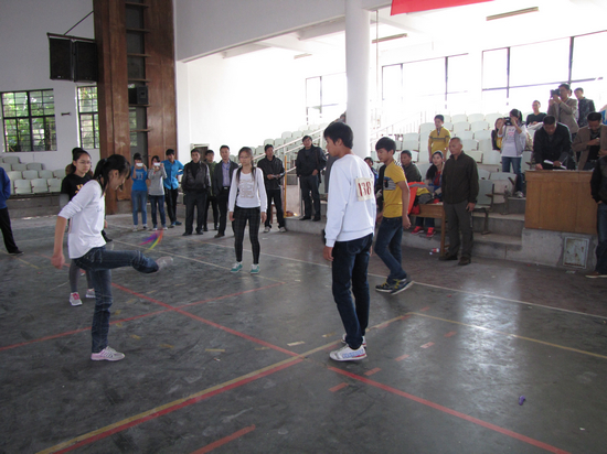 笔者在比赛现场看到,所谓五角星踢毽球,就是5名运动员围成一个直径2.5米开外的圆圈,由一名运动员发球开始,相互传递踢毽,踢传不可以给相邻的队友,毽球落地即算失误,在规定时间内累计成功个数和失误个数。新坝初中以137个的成绩获得该项目的第一名。该校运动经过奋力拼搏,以总分142分的成绩获得初中组第二名。