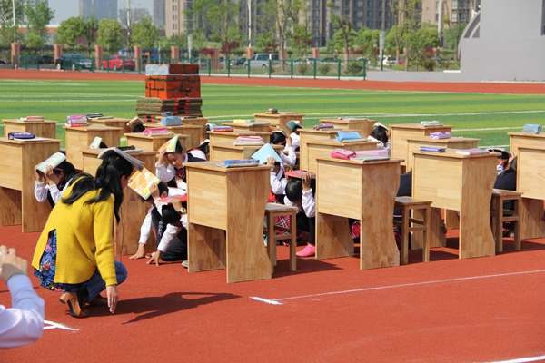 演练开始,刺耳的警报声在平静的校园里骤然响起,随后,演练总指挥,实验小学校长王笑梅重复喊话:“地震来了,不要惊慌!全校进入应急状态!”,同时迅速发出指令,学校启动应急预案,疏散接应组、应急保障组、救护组、搜救组等马上进入任务状态。在应急疏散环节,学校连廊释放烟幕,学生们在老师的带领下,捂住口鼻,弓着身子从烟幕中穿过,迅速赶到操场。随后的现场搜救、应急救护、心理疏导等演练科目同样开展得紧张有序、生动逼真。通过这次演练活动,学校师生全面了解了防灾减灾知识,提高了自救自护和紧急避险的能力。