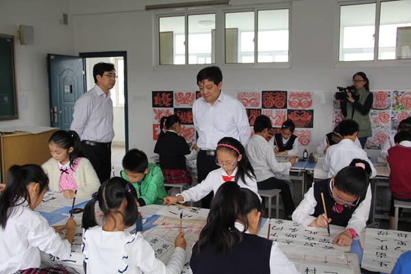 随后,姚司长一行来到区实验小学。近年来,通州实小积极贯彻上级关于语言文字工作的相关精神,积极开展生动活泼的师生诵读活动,推选的诵读节目多次在省、市获得一等奖,书法特色教学也风生水起,上半年成功承办南通市书法教学现场会。姚司长一行兴致勃勃地参观了通州实小古典园林——蕊春园,观看该校学生的地书表演、书法展板,深入到学生书法社团、教师笔会活动中,观摩了实小巫艳秋老师执教的书法活动课,听取了王笑梅校长关于诵读活动开展的汇报。姚司长对通州实小学生的书法和诵读素养表示了充分的肯定,对通州实小语言文字工作的扎实开展充分赞赏。他跟王笑梅校长作了亲切地交流,指出书法教育是素质教育的重要组成部分,能塑造孩子心灵,提升全人的发展,通州实小在这方面的努力已经彰显出成效。还关心地询问通州实小在书法教师编制、课程实施、教材使用等方面的情况,希望在语言文字工作上进一步拓展思路,取得更大的成绩。