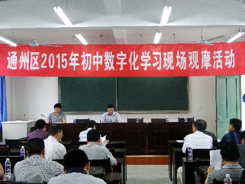 为适应信息化时代教育发展的需要,进一步落实省、市关于基础教育数字化学习试点工作的有关通知精神,推动面上数字化学习工作,促进互联网时代的课堂教学改革,6月19日,通州区2015年初中数字化学习现场观摩活动在兴仁中学举行,本次研讨活动主题为“如何在数字化学习环境下优化课堂教学和转变学习方式”。来自全区各教育督导组、各初中分管教学领导及试点学校的有关领导共50人参加了本次活动。