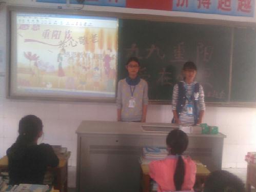 一是校长做一次“孝心敬老”主题教育活动。季校长在操场上面对全体同学讲话,“重阳节又是登高节,是我国传统的节日。尊老爱老是我们中国的文化传统,作为青少年我们应该将这种传统发扬下去。回家要为爷爷奶奶做些力所能及的事情,努力学好知识技能,将来能够有所作为,让家里的长辈们放心。”二是全校举行一次以重阳敬老为主题的手抄报比赛;三是各班召开一次以重阳文化为主题的班会;四是每个学生为身边的老人制作一张卡片,并写上祝福语。