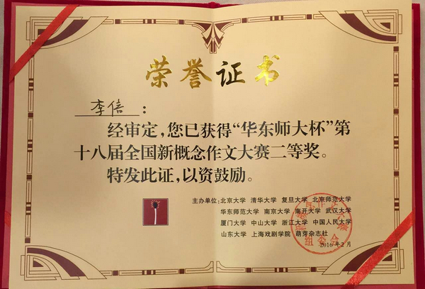 “华东师大杯”第十八届全国新概念作文大赛现场复赛结果近日揭晓,江苏省通州高级中学高二20班学生李倍荣获二等奖。