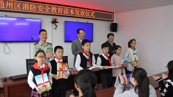 10月13日上午9时,通州区教育局、消防大队在消防大队四楼会议室,联合举行中小学消防安全教育读本发放仪式。城区小学、初中、高中9所学校近40名师生代表参加。区消防大队王林伟大队长主持仪式。教育局刘新副局长讲话。通州小学代表全区中小学表态发言。