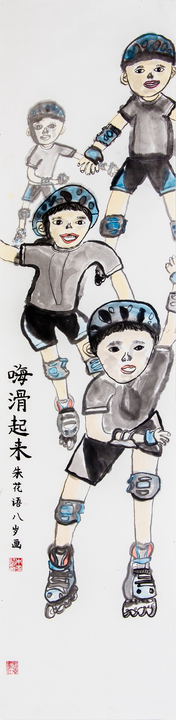 国画《嗨,滑起来》是一幅四尺对开的竖幅长卷,画面上,四个爱轮滑的娃娃们你前我后,准备来一场轮滑表演。“小画家” 朱花语画的正是自己所经历过的生命律动时刻,以心带笔,用情挥墨,整幅作品主次分明、墨色相宜、动态各异、相得益彰。落款“嗨,滑起来”,应景应画,与观众互动交流,不失为点睛之笔。