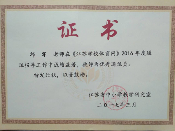 邱军是我区一名普通的体育老师,在工作之余努力提升自己的文化素养,在2004年获苏州大学新闻学本科文凭。在做好本职工作的同时积极撰写新闻通讯,参与学校体育宣传报道工作。2016年,邱老师有一百多篇新闻稿分别被江苏学校体育网、江苏体卫艺网、南通教育网、通州教育门户网等新闻媒体上录用。