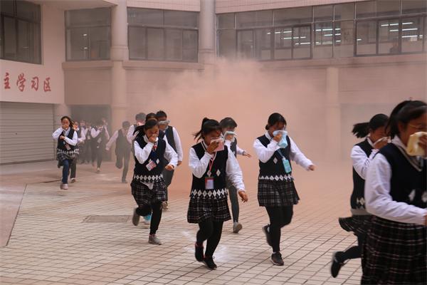 本次火灾应急疏散演练的假设情景为:11月8日下午,金沙中学之远楼发生火灾,此时高一全体师生正在之远楼内上课,情况十分危急。接到报警后,本次消防演习总指挥薛军副校长、现场指挥顾锋杰副校长立即启动消防应急预案,组织协调组、通信联络组、疏散引导组、抢险救护组和后勤保障组立即到位,按照预案设定的分工,组织学生撤离模拟火灾现场。高一全体学生依据消防疏散要求,从各自疏散通道成两路纵队撤离,同学们用湿毛巾捂住嘴、鼻,弯着腰,迅速小跑至操场。高一全体教师进行现场疏散引导,全体师生安全有序撤离至集结地点后,班主任立即清点人数,并由年级组长向级部总负责人报告,级部再向指挥长报告人数,无一遗漏。从准备部分到报警部分、疏散部分,总共用时3分50秒。整个过程安全、有序、快速、高效,获得与会人员的高度评价。