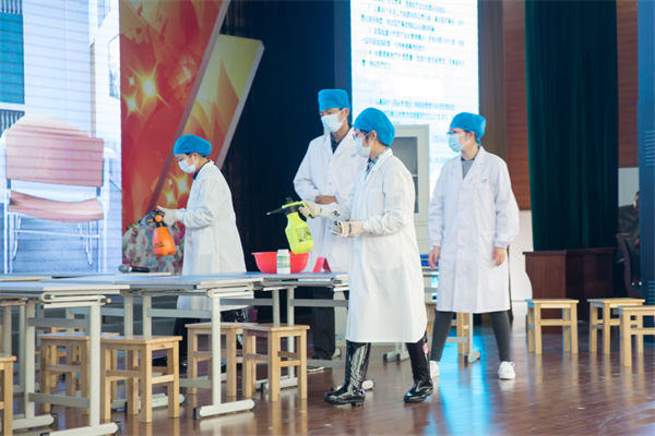 (图4)学校消毒人员在区疾控中心专业人员的指导下进行消毒