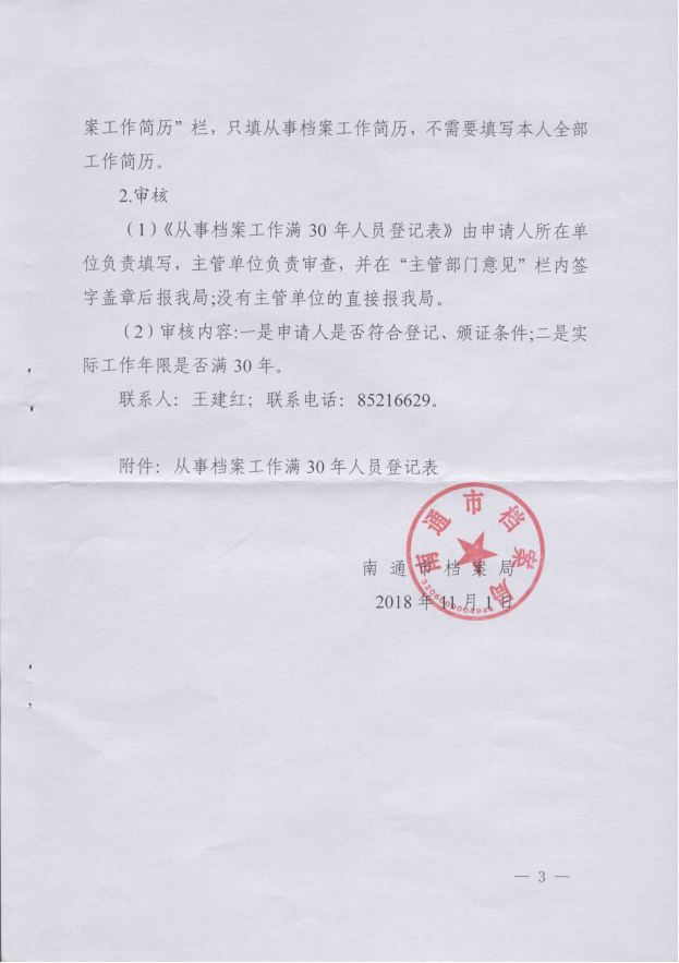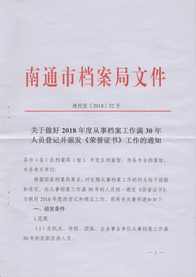 现将南通市档案局《关于做好2018年度从事档案工作满30年人员登记并颁发〈荣誉证书〉工作的通知》转发给你们,请组织本单位及下属单位符合条件者积极申报,并于2018年11月20日前将《从事档案工作满30年人员登记表》及照片报通州区档案局秘书编研科办理,过期将顺延至下一个年度。
