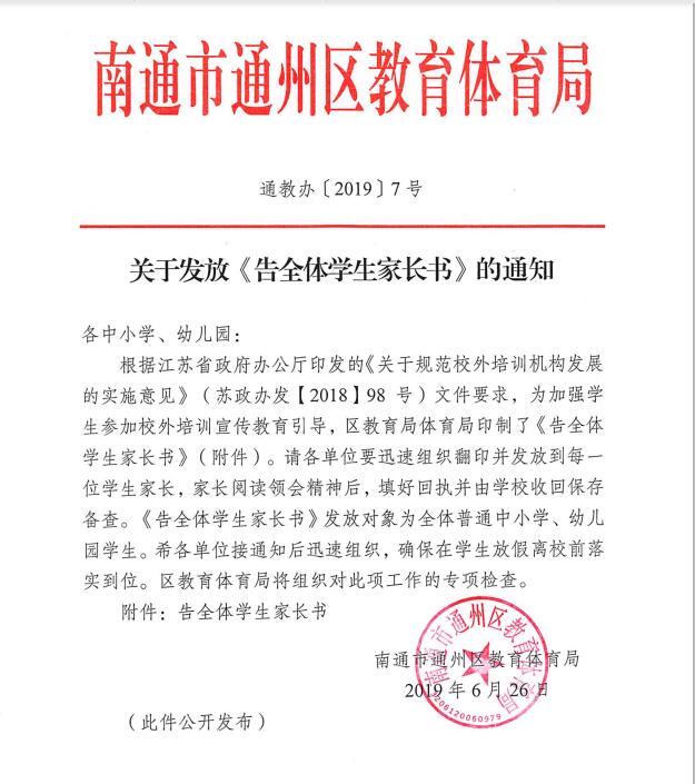 关于发放《告全体学生家长书》的通知