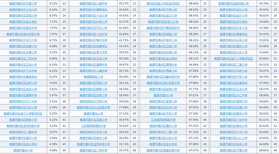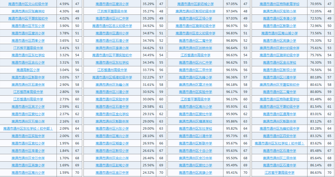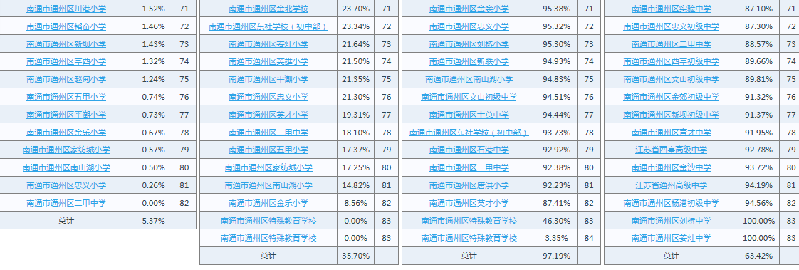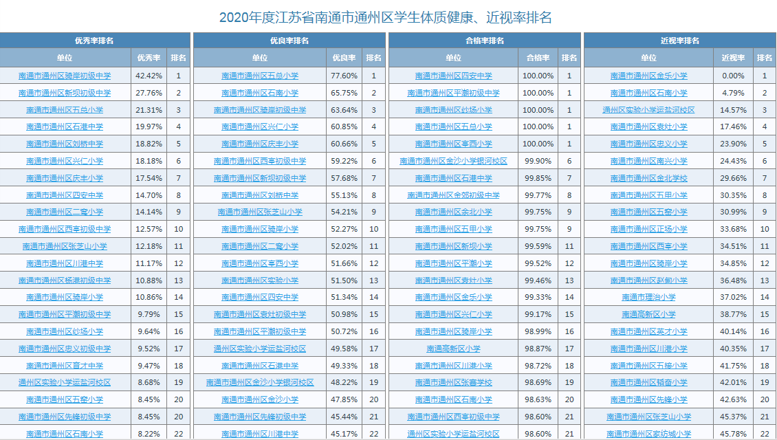 2020年度江苏省南通市通州区学生体质健康、近视率排名公示