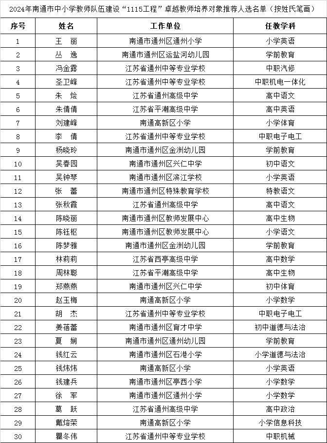 根据南通市教育局《关于遴选南通市中小学教师队伍建设“1115”工程第二批卓越教师培养对象的通知》(通教人师函﹝2024﹞2号)文件精神,经个人申报、学校初审、专家评审、会议讨论,拟确定王丽等30名同志为南通市中小学教师队伍建设“1115”工程第二批卓越教师培养对象推荐人选。