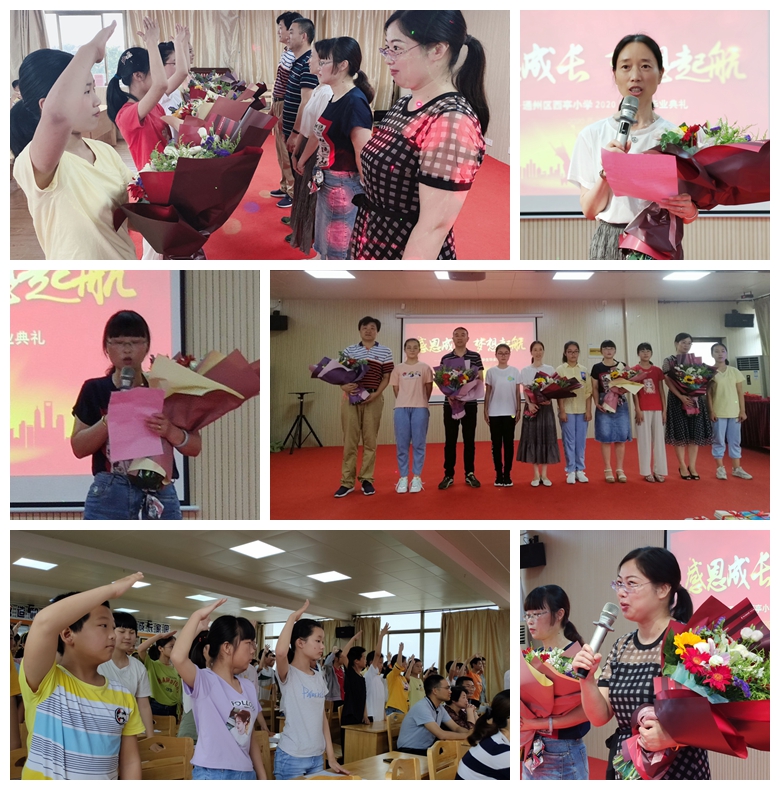 最后,主持人带领全体毕业生庄严宣誓,铿锵的誓言响彻大厅,宣告了亭小学子报答师长、报效祖国、为母校争光的决心和信心!