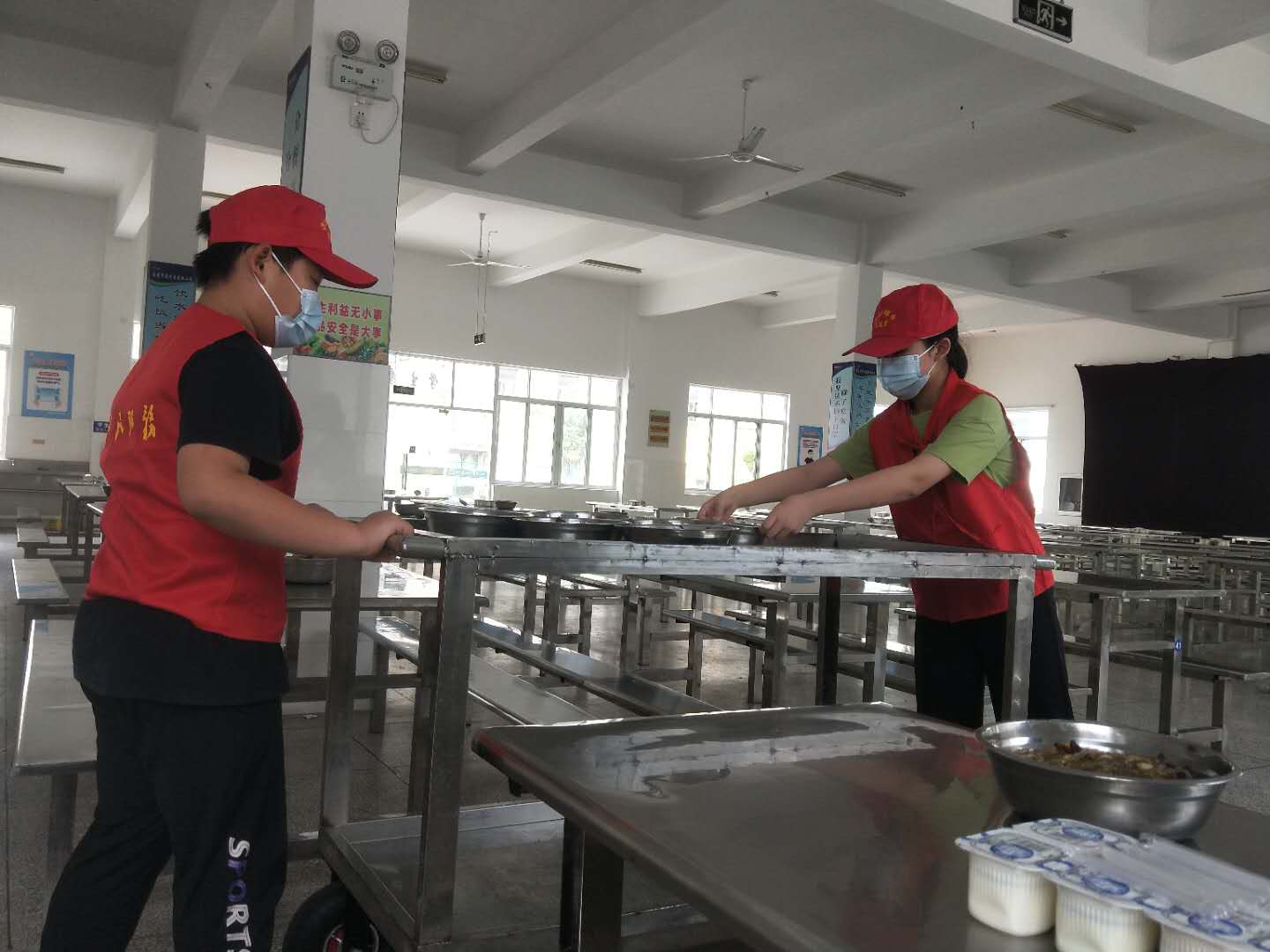 小志愿者们带上口罩,走进食堂,在食堂工作人员的指导下进行摆餐具、推餐车、端饭菜等劳动实践活动。瞧!小志愿者们两人一组,全神贯注地推着餐车,小心翼翼地将饭菜一一摆放在桌上,配合默契的他们成了食堂里一道靓丽的风景线。