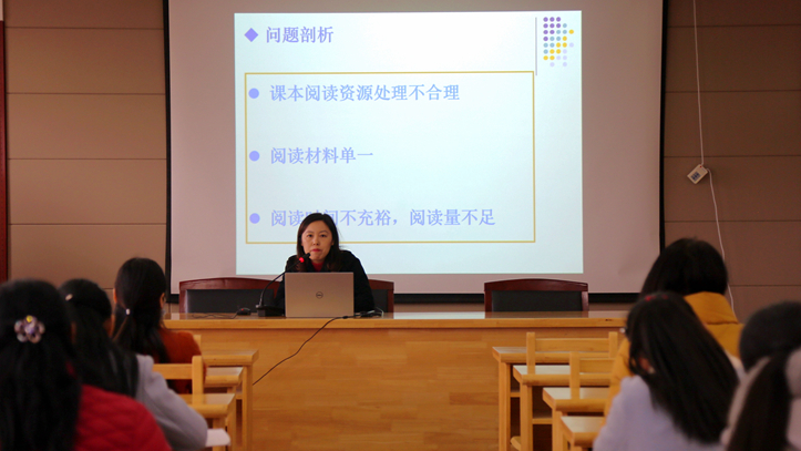 实验中学的徐轶敏老师所做的《初中英语深度阅读教学探究》,有理论,有佐证:抛出问题“来自教学的困惑”,引发思考。徐老师从“课本阅读资源处理不合理,阅读教材单一,阅读时间不充裕,阅读量不足”这几个方面进行了深度剖析。