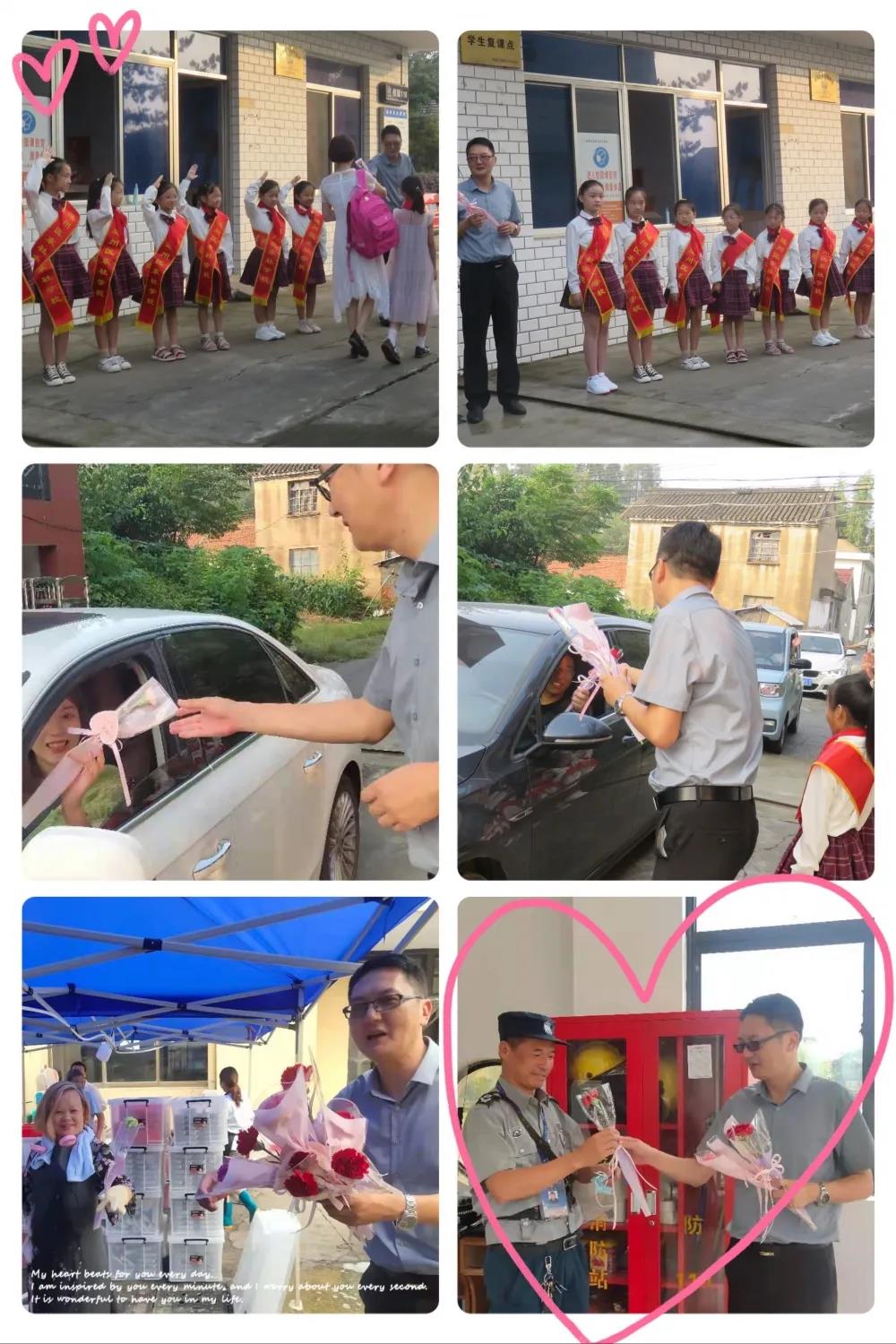 暑退九霄净,秋澄万景清。 9月10日这一天,是最寻常的一天,又是最不寻常的一天。清晨,东社学校的校园内彩旗招展,花香四溢,到处充满着浓浓的节日气氛。学校校长和文明礼仪值日生已经早早站在校门口用鲜花迎接每一位教职员工。