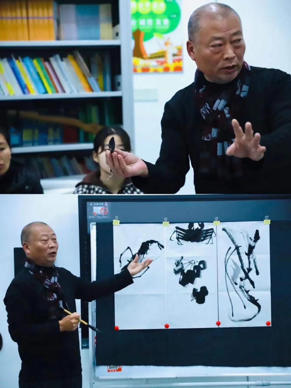 南通美协核心会员、通州美协专业理事、通州画院特聘画师、实验小学运盐河校区周文新老师给老师们带来了精彩的水墨画讲座,周老师从基础的握笔姿势、笔墨纸砚的特性给老师们进行了深入浅出的讲解,接着展开点、线、面等绘画元素的培训。笔触的改变、指尖的力度,看似无奇的墨汁,在水的混合下呈现出层出不穷的深浅变化,清新淡雅。