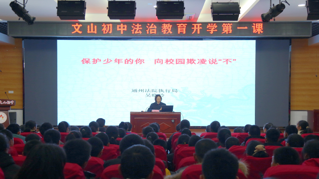 为进一步推进“法治进校园”工作,增强同学们的法治意识,接受法治教育,自觉遵纪守法,学会利用法律进行自我保护,通州区法院执行局副局长吴晓玲女士走进文山初中,为同学们带来了一节“保护少年的你,向校园欺凌说‘不’”为主题的法治第一课。