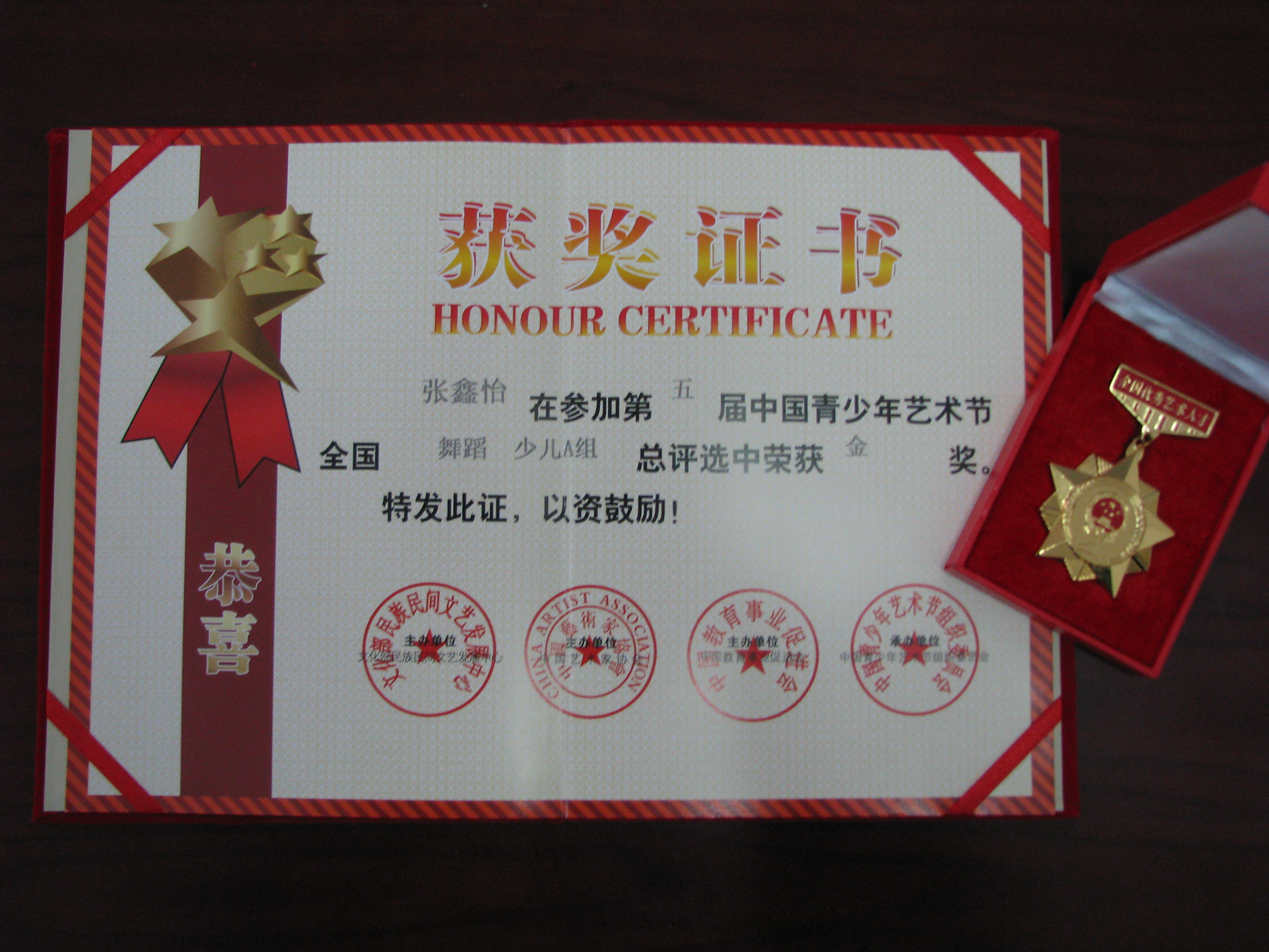在第五届中国青少年艺术节上,我宫舞蹈班学员张鑫怡表演的独舞《草原情》和陆蕾蕾表演的独舞《天路》,继7月20日分别夺得江苏省总评选金奖后,又在8月12日进行的全国总决赛中双双夺得金奖,并各自荣膺全国优秀艺术人才金质奖章一枚,同时被接受为中国艺术家协会会员,荣获“小艺术家”称号。