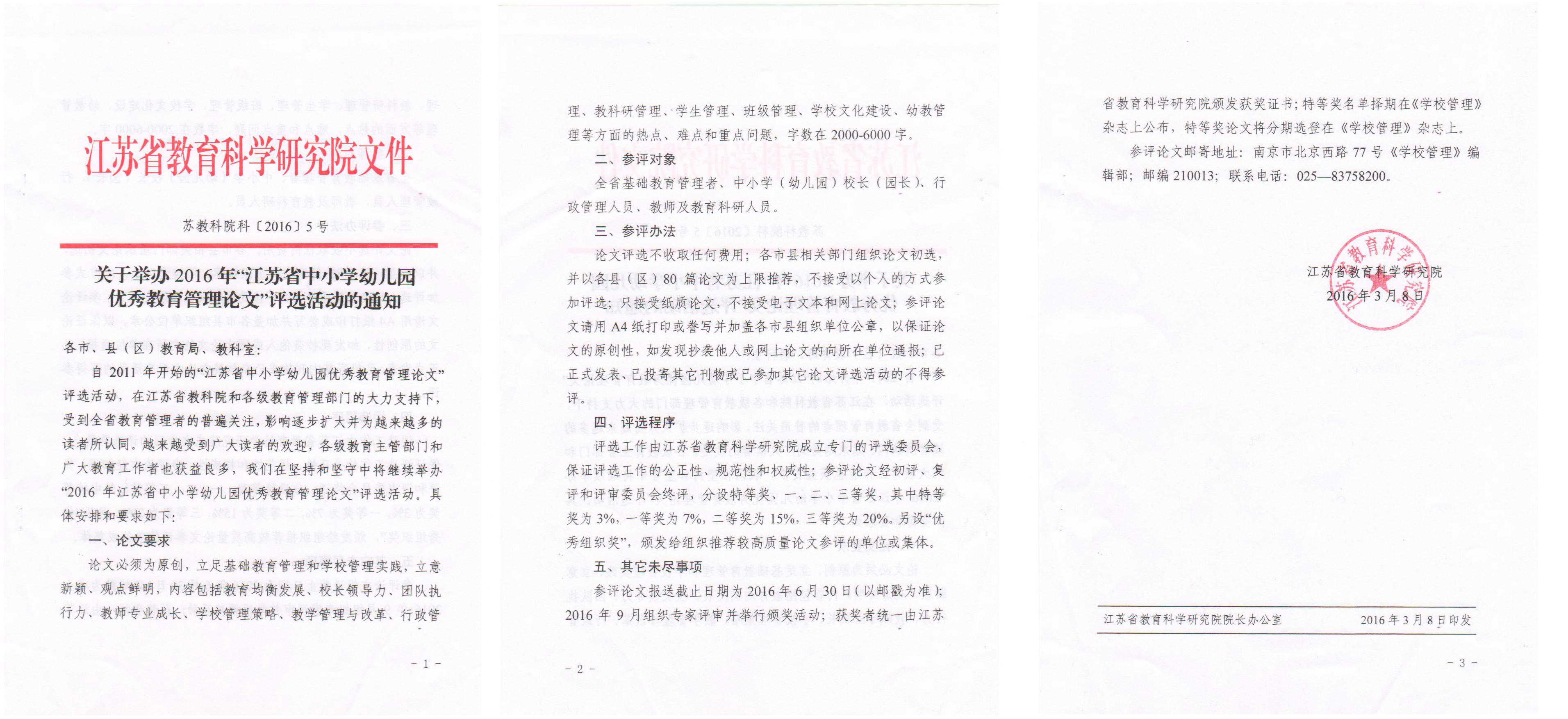 关于做好2016年“江苏省中小学幼儿园优秀教育管理论文”征文活动的组织和初选工作的通知