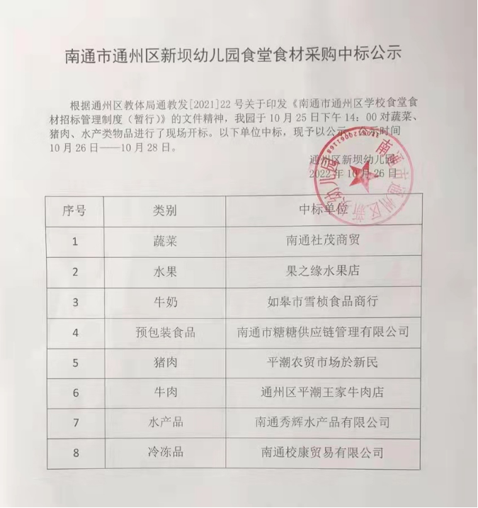 南通市通州区新坝幼儿园食堂食材采购中标公示