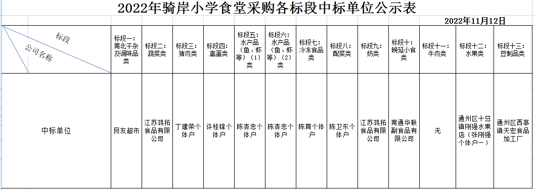 根据《南通市通州区骑岸小学食堂食材采购及配送项目竞争性谈判公告》及文件规定,2022年11月12日上午9:30,学校进行了本学期第二次竞争性谈判,经招标组评标,以下单位为骑岸小学食堂食材供应商。现予以公示。