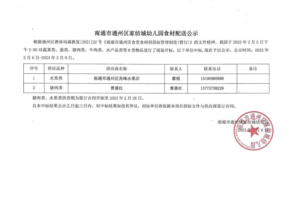 南通市通州区家纺城幼儿园食堂食材配送中标公示(二)