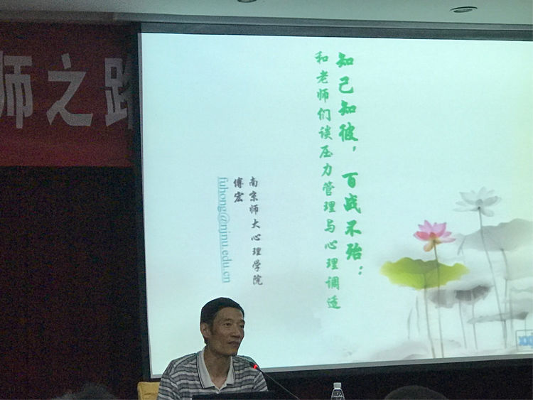 傅宏教授和老师们谈压力管理与心理调适,我感触最深的是人人都要增进理解与关爱,合理沟通与交流,放松与调节心情,也就是说,我们老师有了健康阳光的心态,我们才能照亮学生的心灵。其次就是在日常教育中,我们要多理解倾听学生的心灵,教育才能深入人心,收到更好的效果。