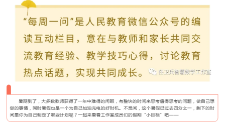 暑期让大多数教师获得了一年中难得的闲暇,如何让教师利用这整块的时间来思考值得思考的问题,做自己想做的事,为自己更好地加油充电呢?南通市中青年名师任卫兵工作室借助“人民教育”微信公众号编读互动栏目,组织工作室成员开展了“互晒假期目标 共谋全人发展”交流活动。