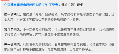 工作室成员、南通高新区小学赵玉梅主任确定了“追寻健康生活状态,为新任务蓄力”“调整大脑思考模式,为新发展充电”的假期目标;工作室成员、实验小学副校长丁亚光的“读一点闲书”“写几句闲话”“养一份闲情”假期小目标,较好地处理了“闲”与“忙”的关系。