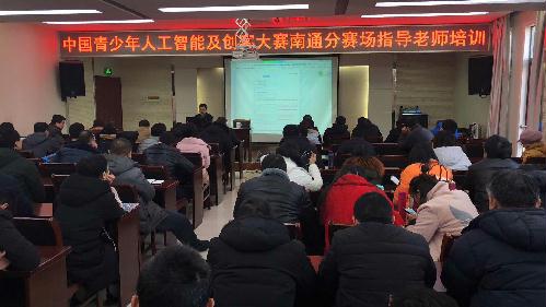 由中国教育装备行业协会创造教育分会南通研究中心承办,通州区教育技术装备室协办的中国青少年人工智能及创客大赛南通分赛场指导老师培训活动2018年2月6日在南通高新区小学举行,来自南通市各县(市)部分学校的创客教育老师共八十多人参加培训。