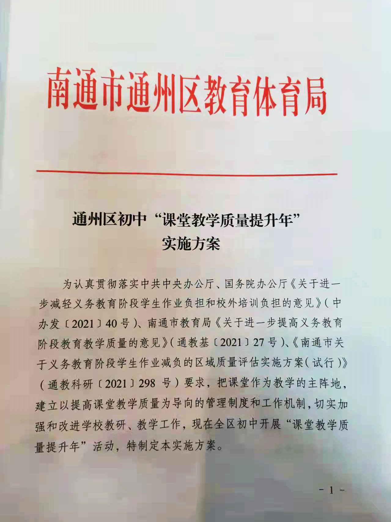通州区初中“课题教学质量提升年”实施方案