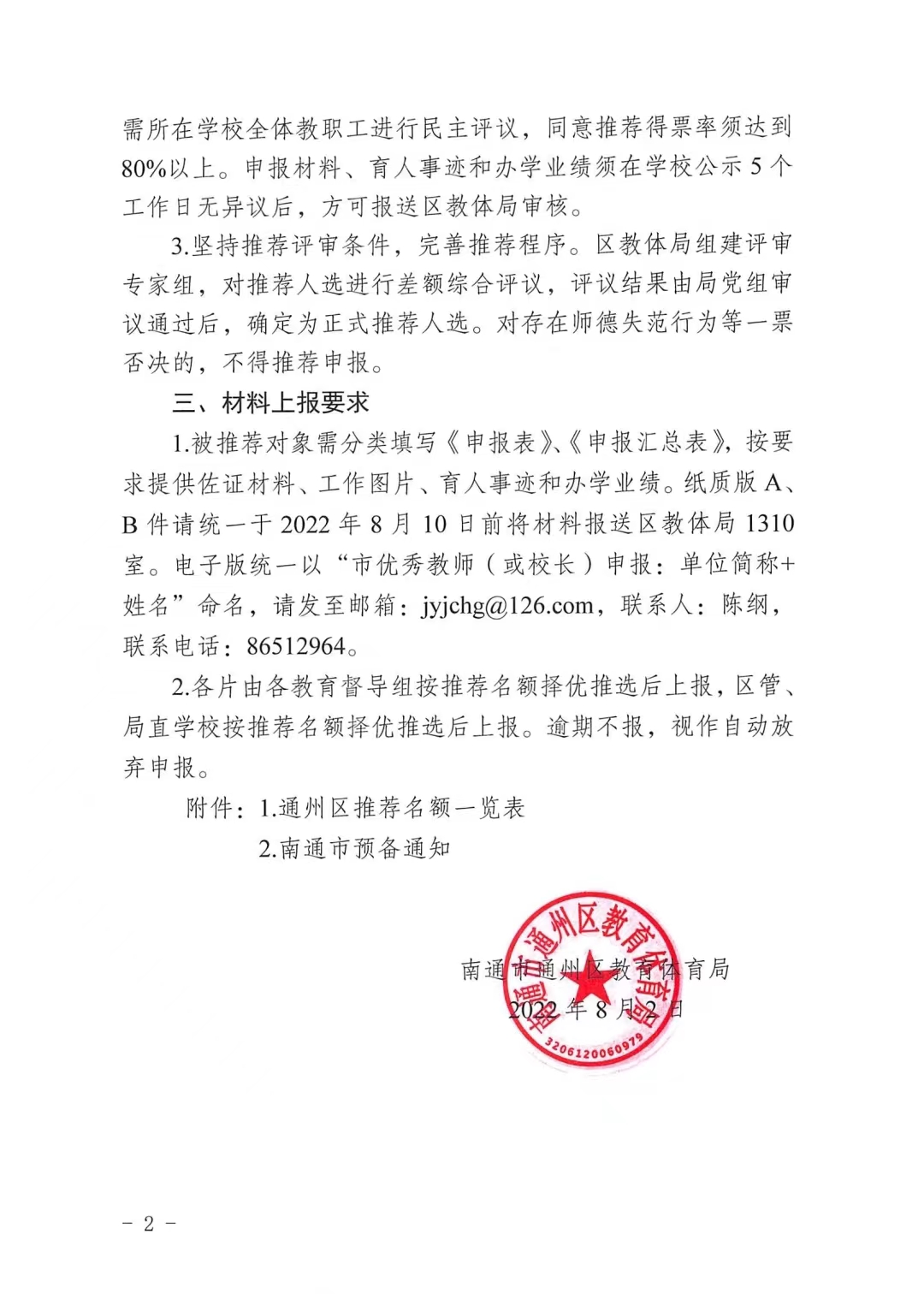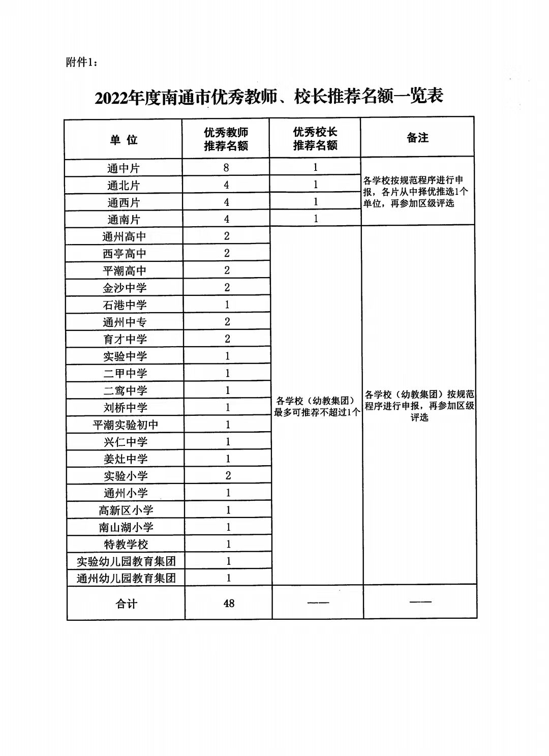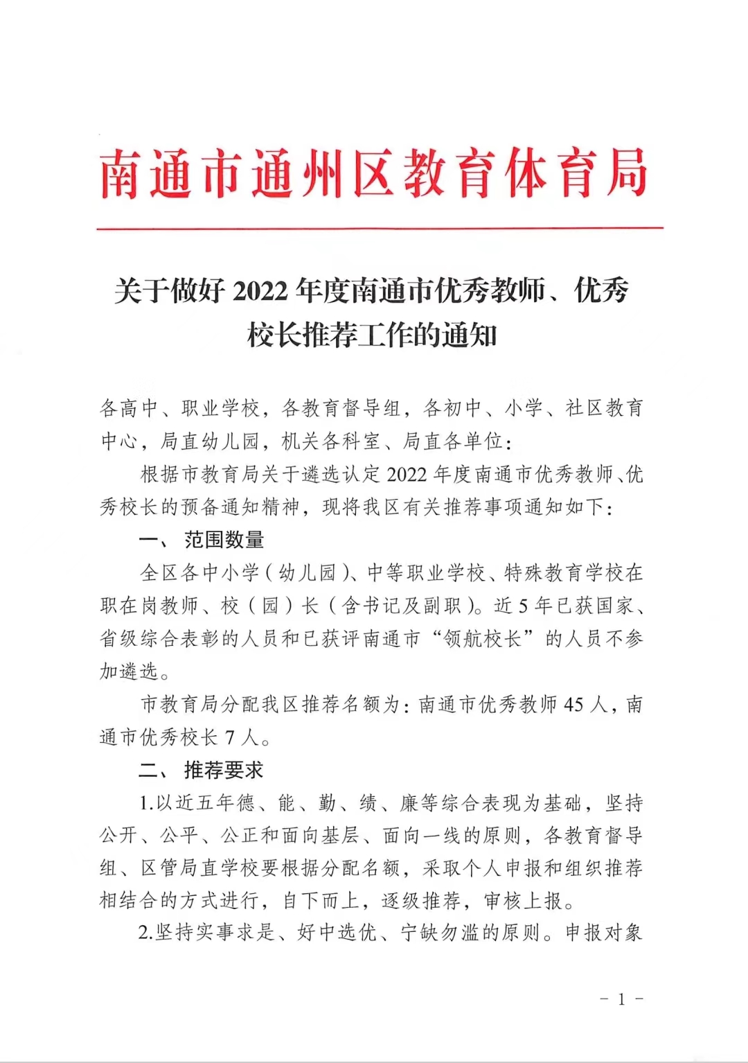 关于做好2022年度南通市优秀教师、优秀校长推荐工作的通知