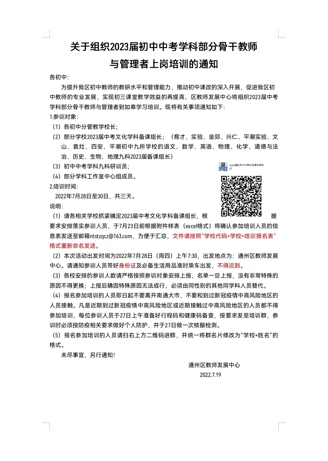 关于组织2023届初中中考学科部分骨干教师与管理者上岗培训的通知