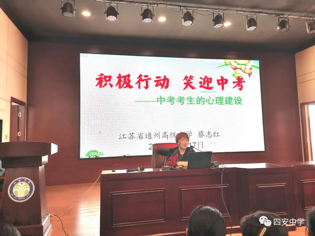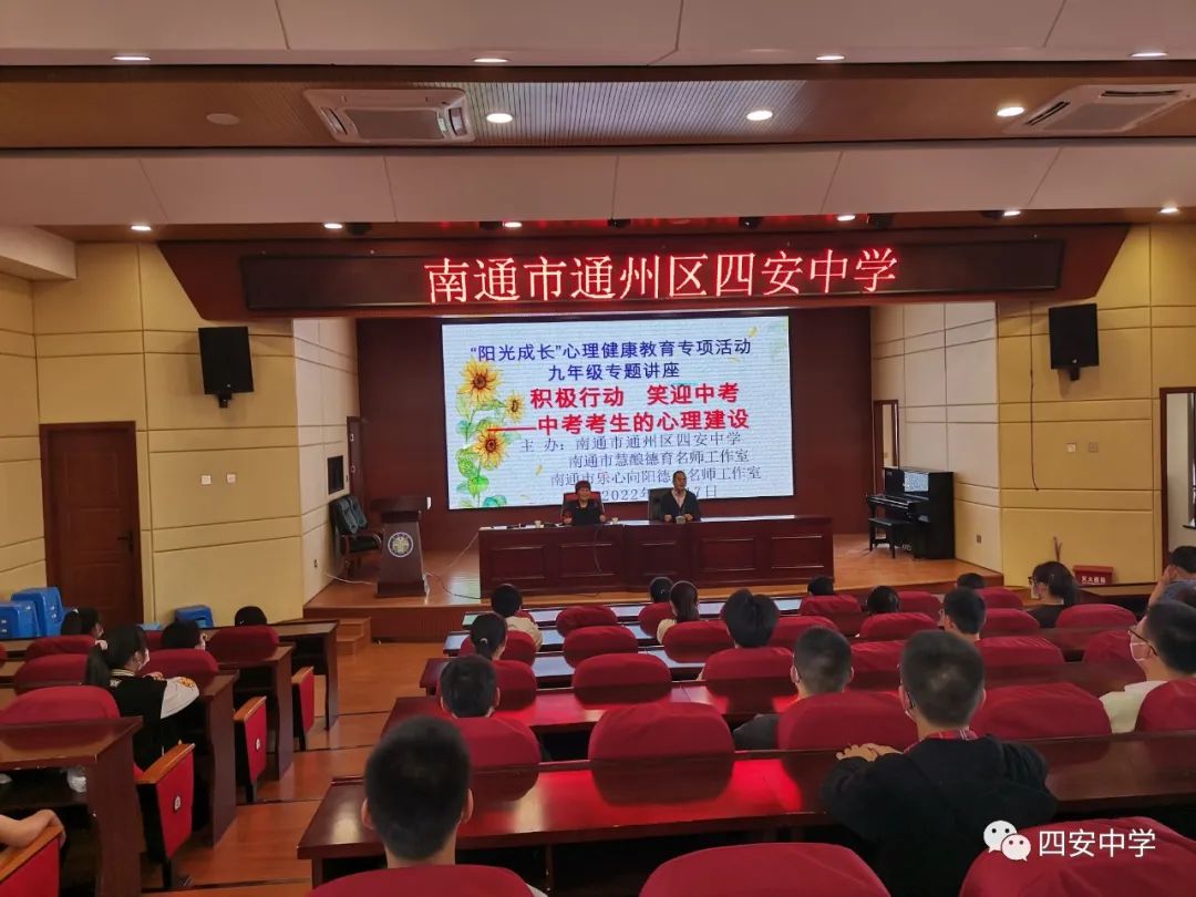 为迎接中考的到来,缓解初三学子的压力和焦虑心理,5月17日下午,南通市通州区四安中学、南通市慧酿德育名师工作室、南通市乐心向阳德育名师工作室联合举办了面对四安中学九年级全体学生的心理健康教育专题讲座,讲座由四安中学副校长、南通市慧酿德育名师工作室领衔人吴春园主持。