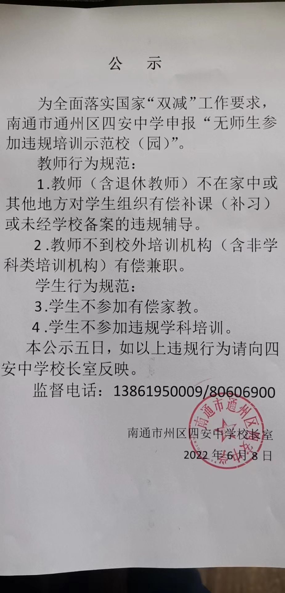 南通市通州区四安中学 地址:南通通州区兴仁镇四安社区文卫路7号