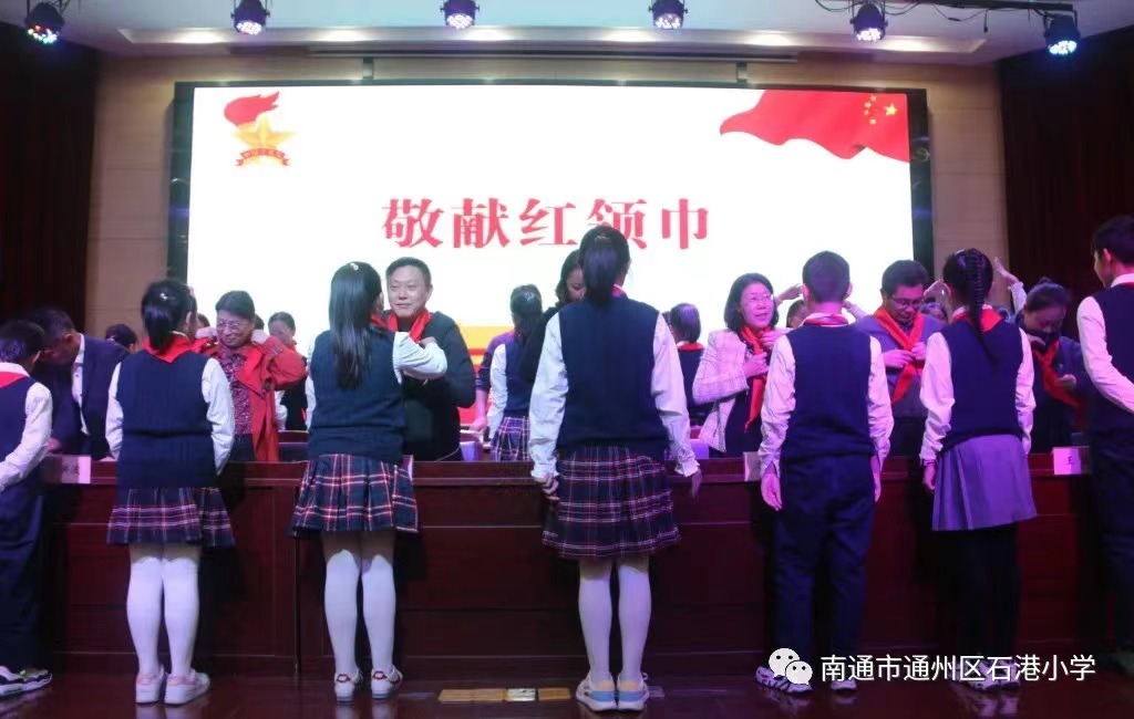 少先队员代表向参加此次活动的领导、辅导员代表献上红领巾,鲜艳的红领巾映衬着领导和辅导员们充满笑意的脸庞,共享少先队的光荣时刻。