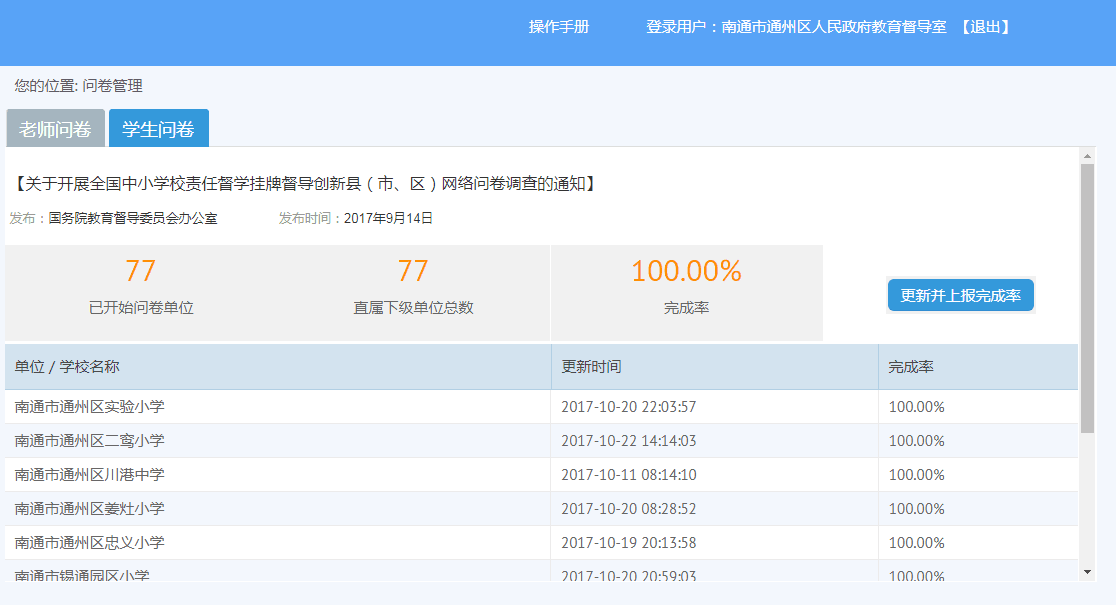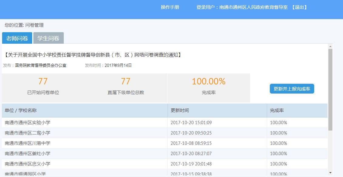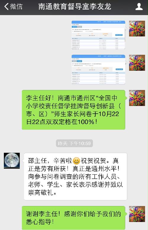 南通市通州区“全国中小学校责任督学挂牌督导创新县(市、区)”师生家长问卷完成率于10月22日22点双双定格在100%!