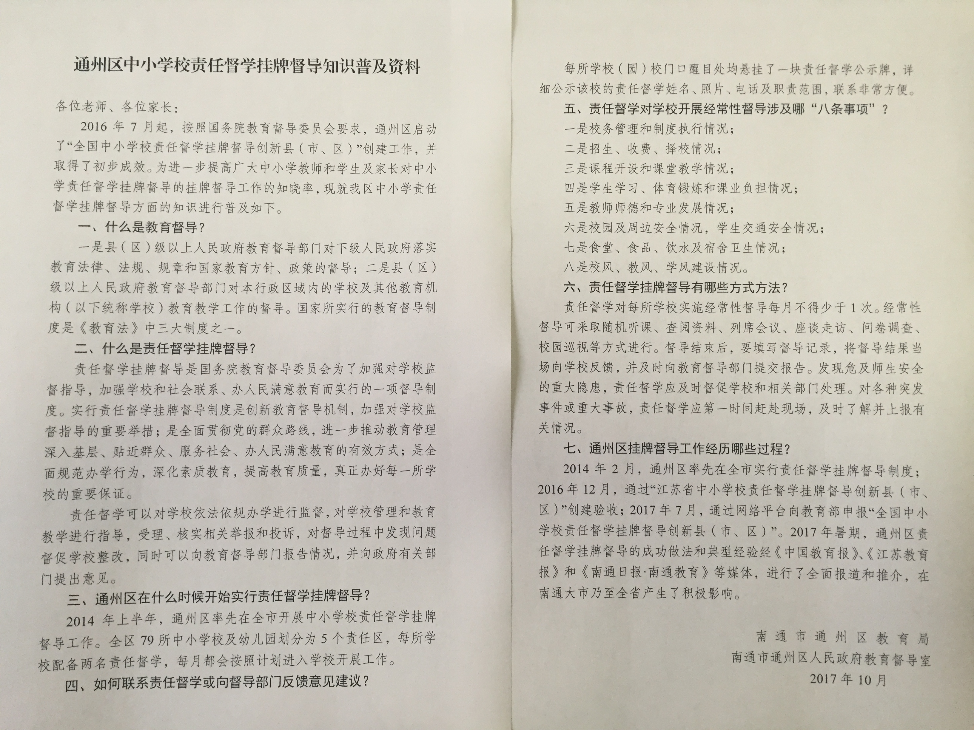 为进一步提高广大中小学教师和学生及家长对中小学责任督学挂牌督导的挂牌督导工作的知晓率、参与度,区政府教育督导室在副区长、总督学樊小燕直接关心与指导下,就我区中小学责任督学挂牌督导方面的知识进行普及。